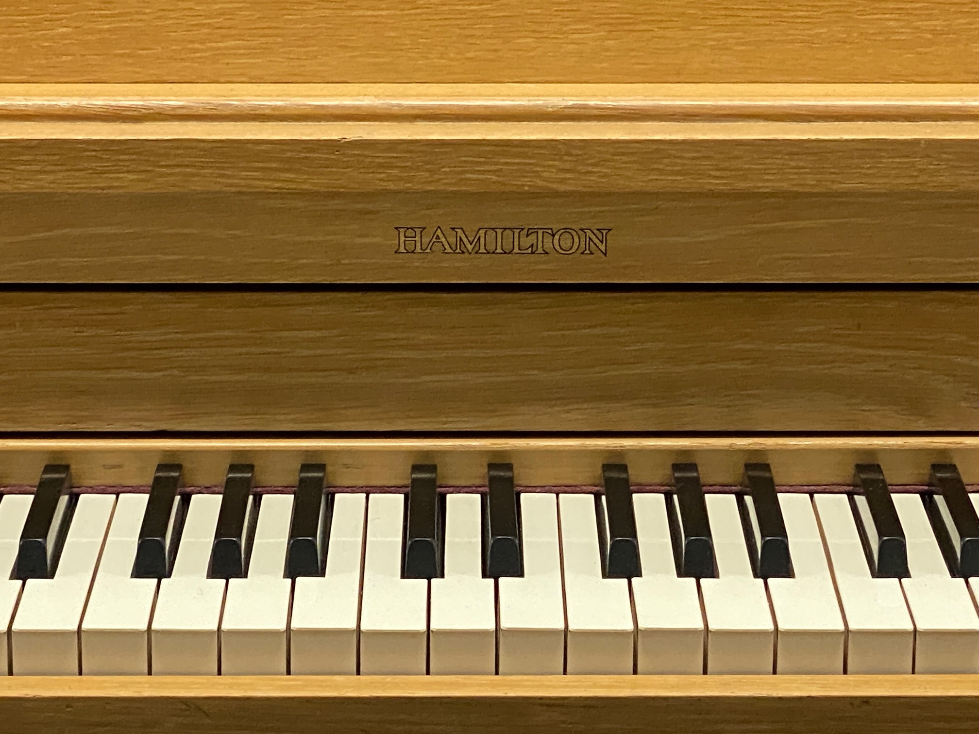 The Hamilton Piano Company was originally established as “The Hamilton Organ Company” by D. H. Baldwin in 1888. The “Hamilton” brand label was named after Dwight Hamilton Baldwin, founder of the famous Baldwin Piano & Organ Company. “Hamilton” brand organs were the first instruments actually manufactured by Baldwin. The firm began building pianos in about 1890 at which time the name of the firm was changed to “The Hamliton Piano Company”.“Hamilton” has always been known for being a well made, durable piano of good quality, and was marketed to be a more affordable alternative to the costlier Baldwin line. For over a century, Hamilton pianos were often found in schools, churches, and studios where pianos were meant to endure harsh and constant use. Today, the Baldwin and Hamilton names are owned by the Gibson Guitar Company of Nashville, Tennessee.