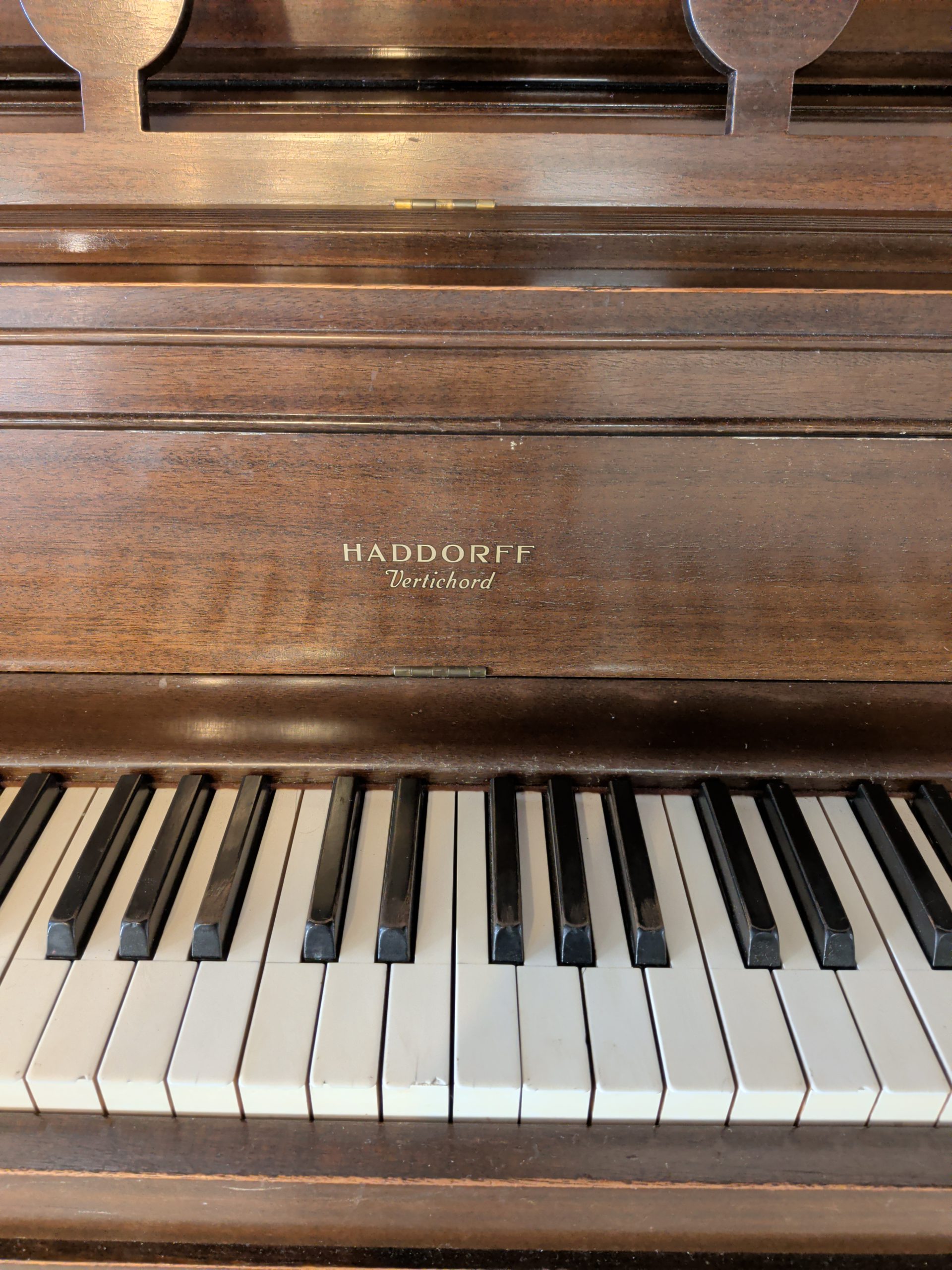 One of Haddorff’s most famous contribution to the piano industry was their introduction of the “Vertichord”, a small upright piano introduced the 1930’s. After World War ll, the Haddorff name was bought by Conn, who shortly thereafter sold the Haddorff name to The Kimball Piano Compay. Kimball discontinued the Haddorff piano brand name around 1960.