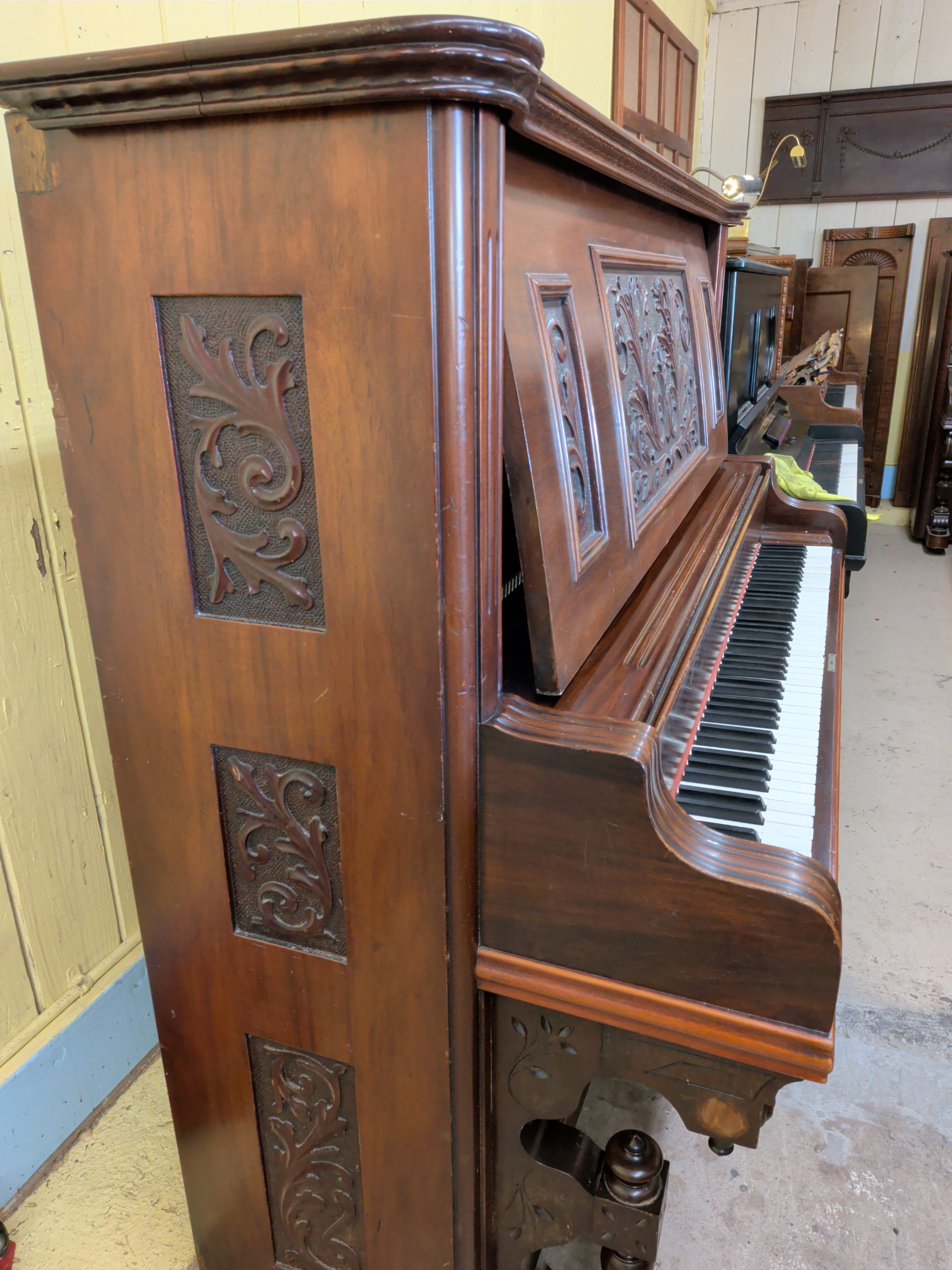 This is a one of a kind gorgeous cabinet grand has stunning detail on the front and down the side of the piano. It’s an excellent play as well.