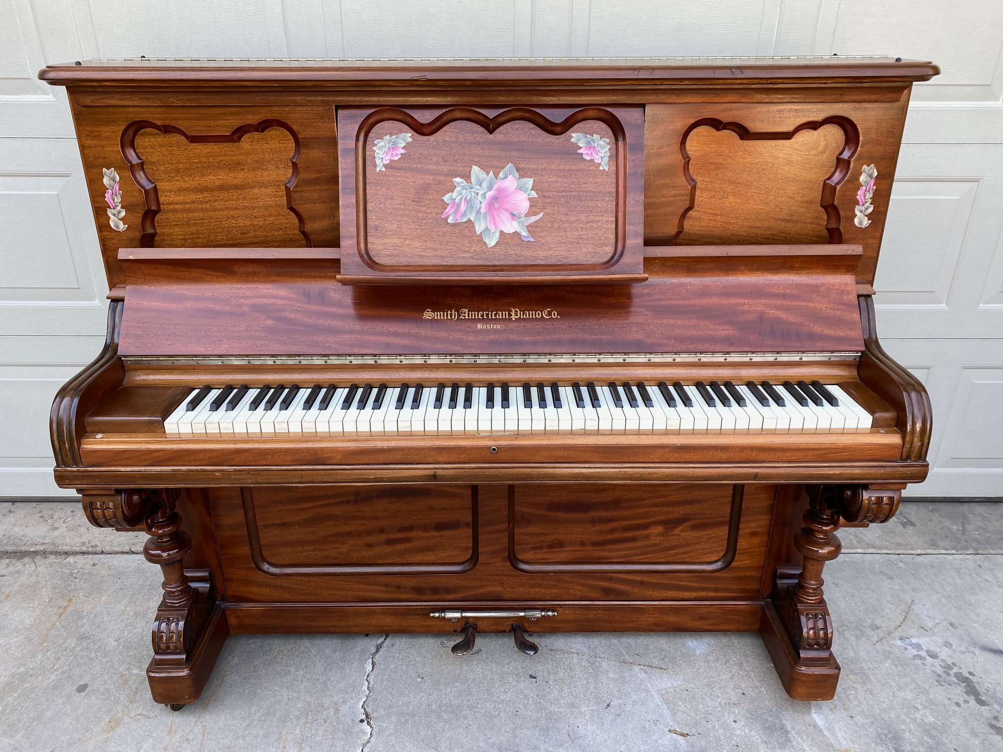 The Smith American Company was originally established in Boston by S. D. Smith and H. W. Smith as early as 1852. First known as “The Smith American Organ Company”, the firm started out building high end parlor organs and melodeons. In the early 1880s, the firm began building pianos and the name of the firm was changed to “The Smith American Organ & Piano Company”. In 1889, the firm acquired The Regal Piano Company from The New England Piano Company, and the firm reorganized as “The Smith American Piano Company” by the 1890s. The Smith American Piano Company built and controlled the Regal Piano Company line until 1903. Many of the instruments by Smith American were also labeled as “The Palace Of Music”. It appears that the Smith American was out of business before The Great Depression.